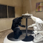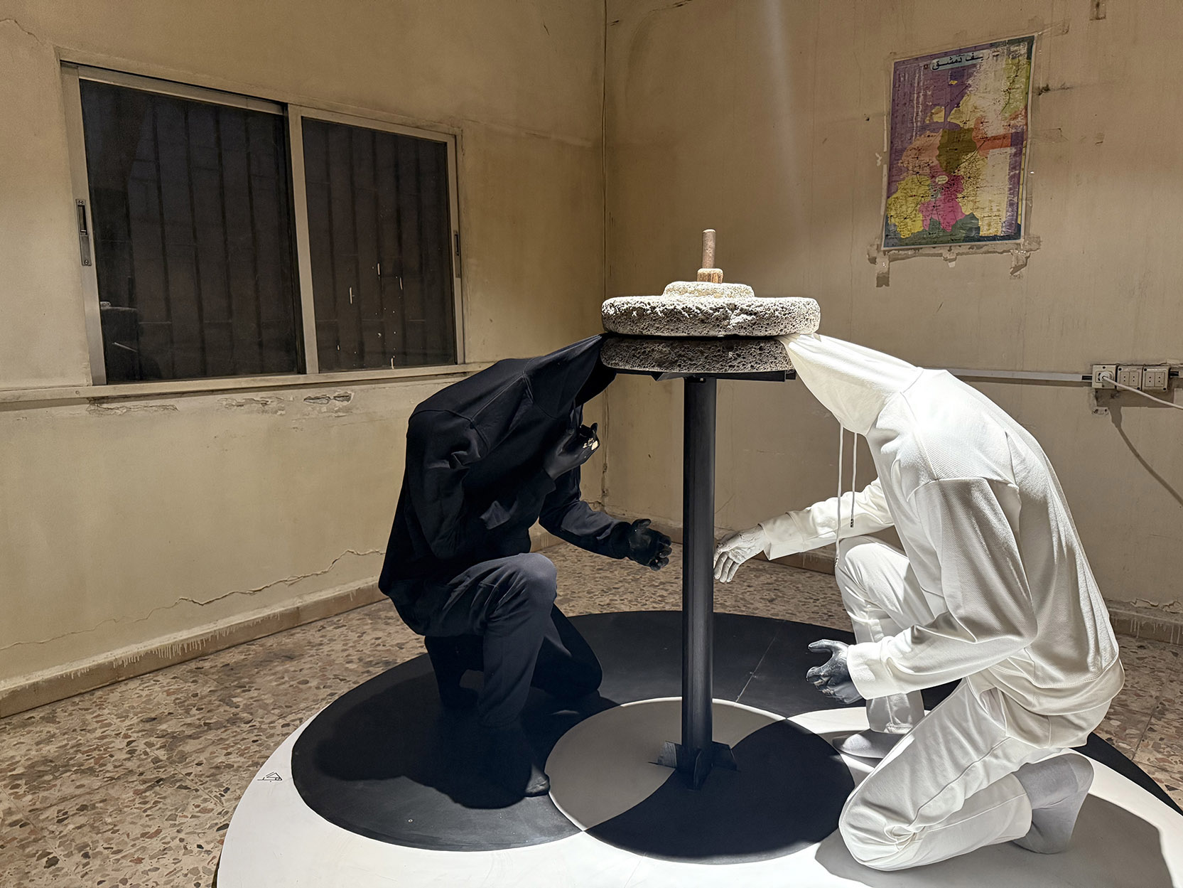 In the corner cell, two hooded figures kneel beneath a concrete disc in “The Prisoner” by Majid Al-Atrash. Their heads are forced upward into the mechanism, as if crushed by the very system they’re trapped within. The black-and-white suits, devoid of faces, suggest anonymity in suffering. Here, violence is not metaphorical. It’s mechanical. It repeats.