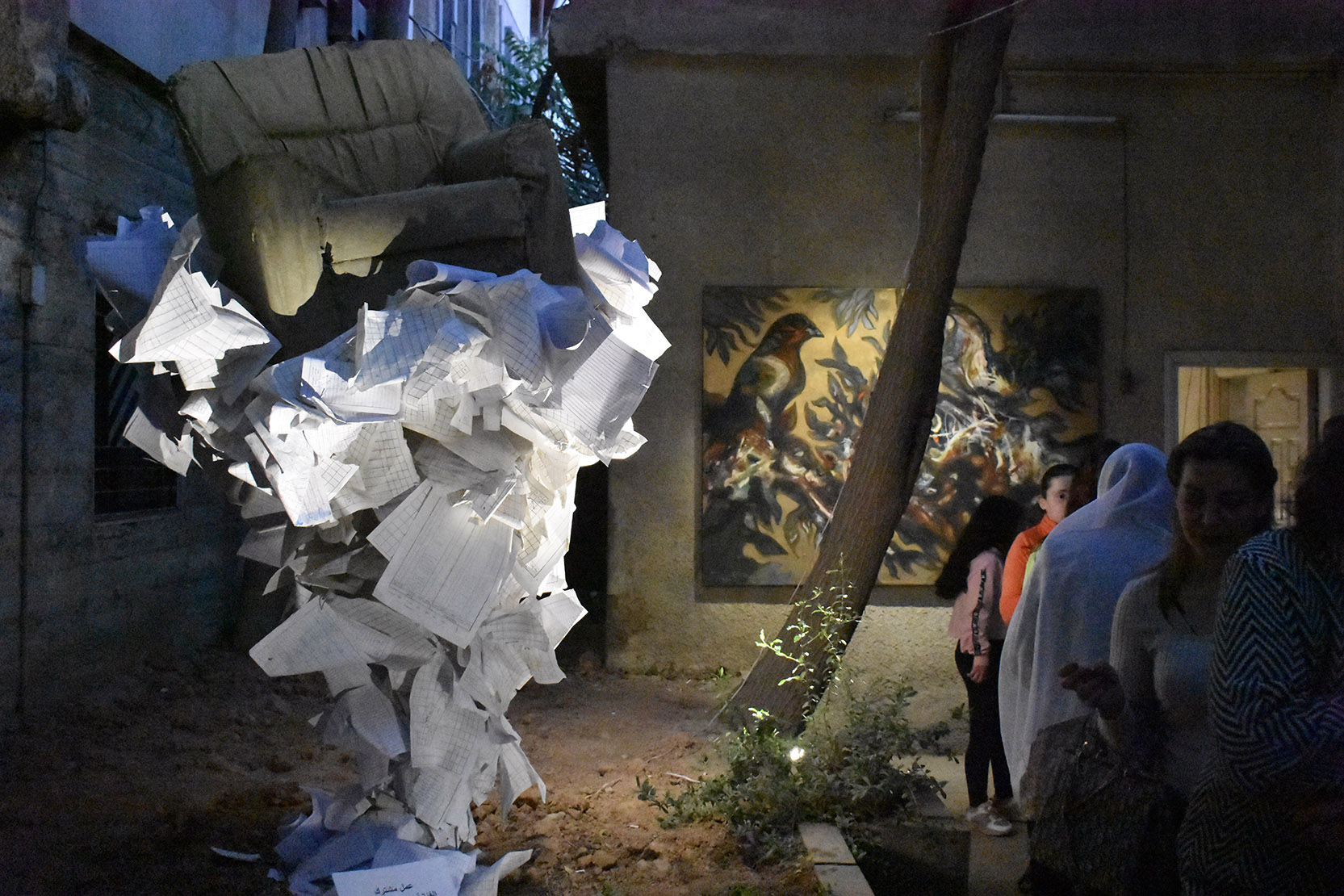 Outside, the earth has been scraped bare. An overturned armchair lies impaled in a burst of tattered documents — actual school records, report cards, state memos — now crumpled and spilling like intestines. This is “Report,” a collaborative work by Nada Aql and Wassim Al-Humaidi. What once upheld bureaucratic power is now weightless and scattered. The system collapses not with fire, but with quiet rot.