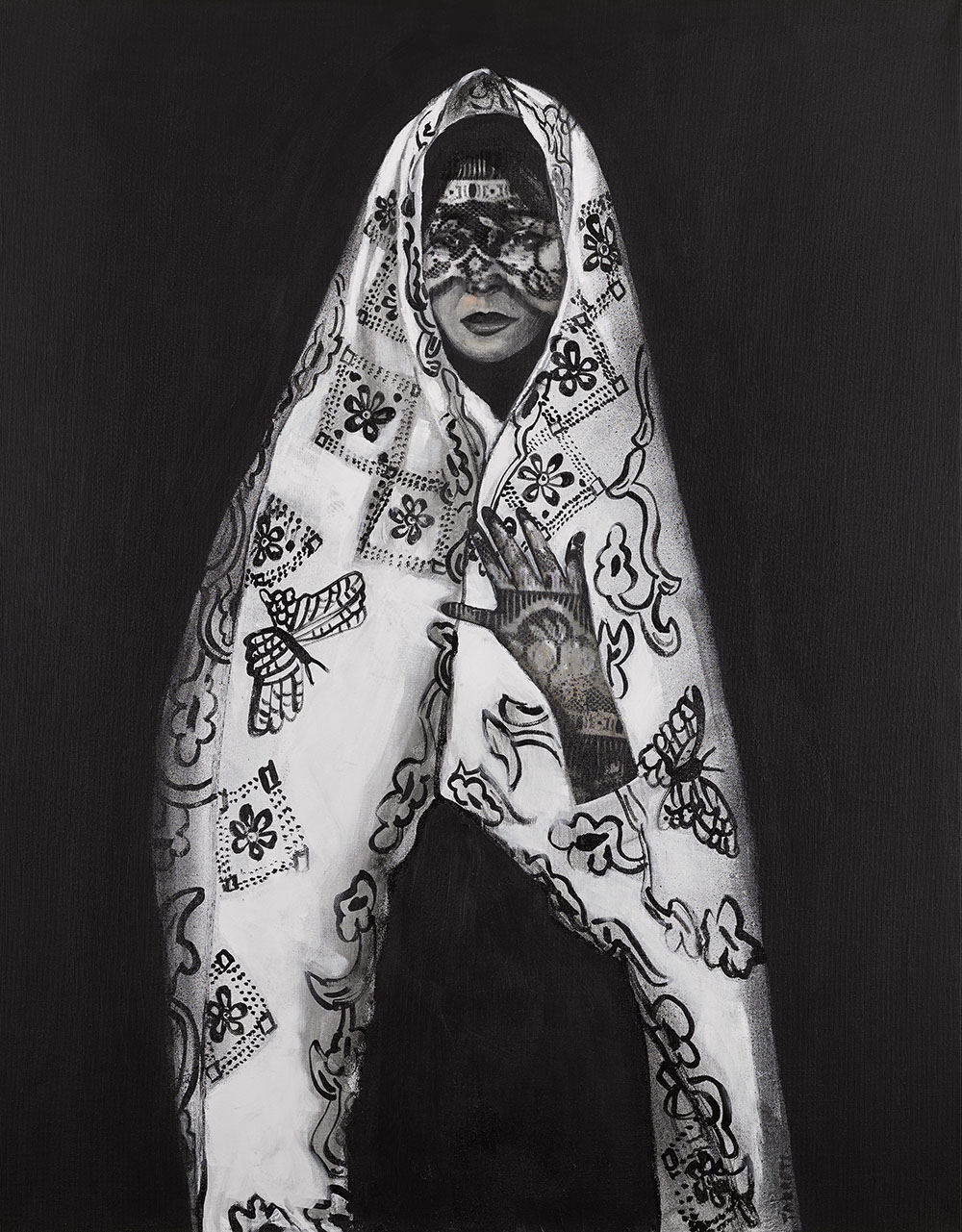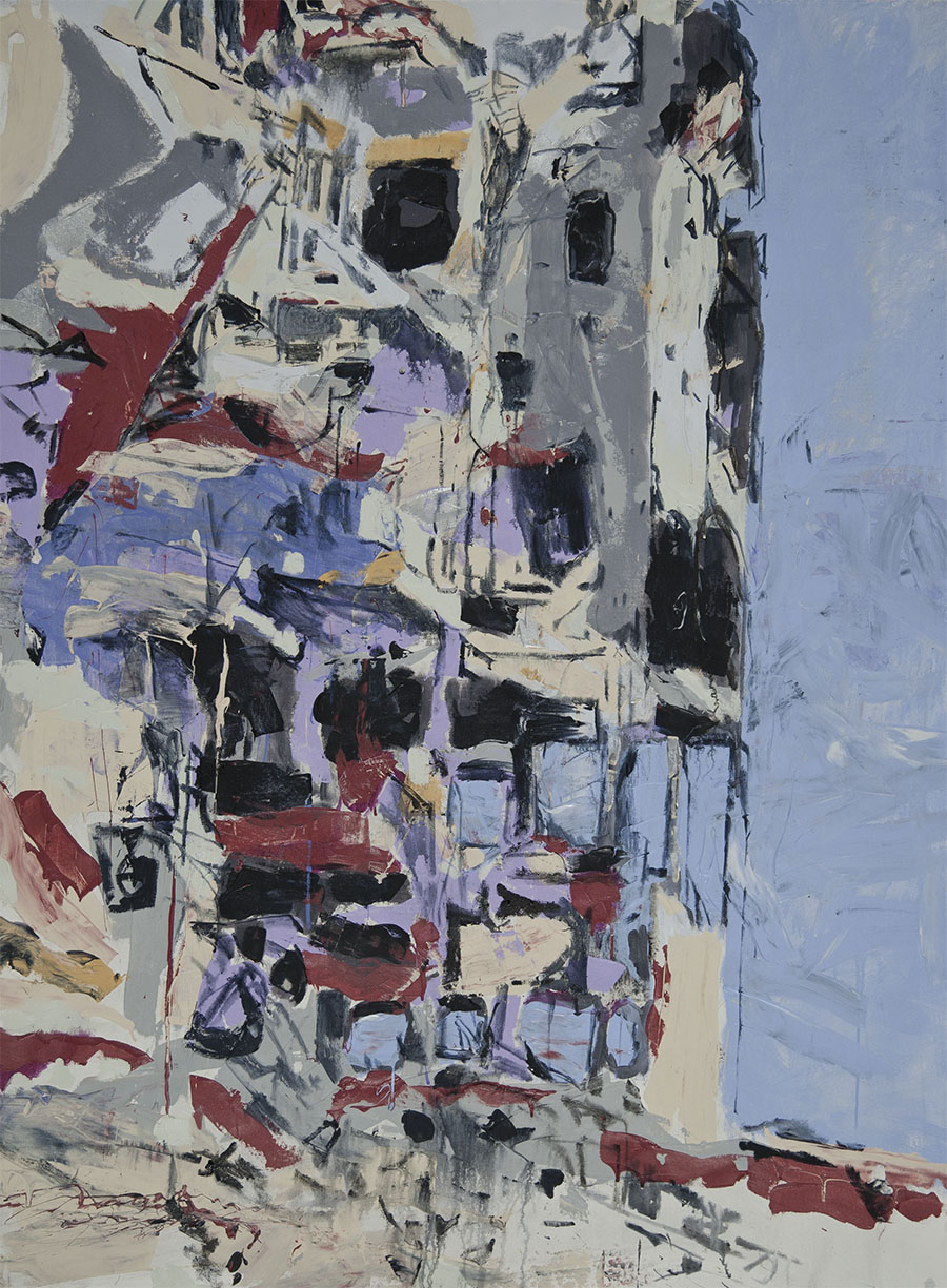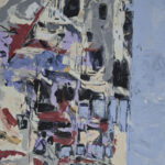 Well-known Syrian artists like Kais Salman or Khaled Takreti, whose works I had seen at Beirut’s Ayyam a decade ago, bring respectively, as Salman always does, an almost sculptural physicality of painting, depicting the sensory, political and emotional overwhelm of the present moment; and Takreti asks questions about how do we construct personal identity in the middle of such turbulence. Tammam Azzam is one of the most prominent Syrian artists from the revolution years, made famous for his photoshopped Klimt’s “The Kiss” against the background of a derelict Syrian building. His 2013 piece in the show, “Damascus” from the just as iconic  Bon Voyage Series, also shows a destroyed home, this time flying away in balloons, with powerful resonance for Syrians who nowadays wonder whether it’s time to return home. His acrylic painting, “Storeys Series,” looks at a home that has been bloodied and sullied and can no longer be recognized.