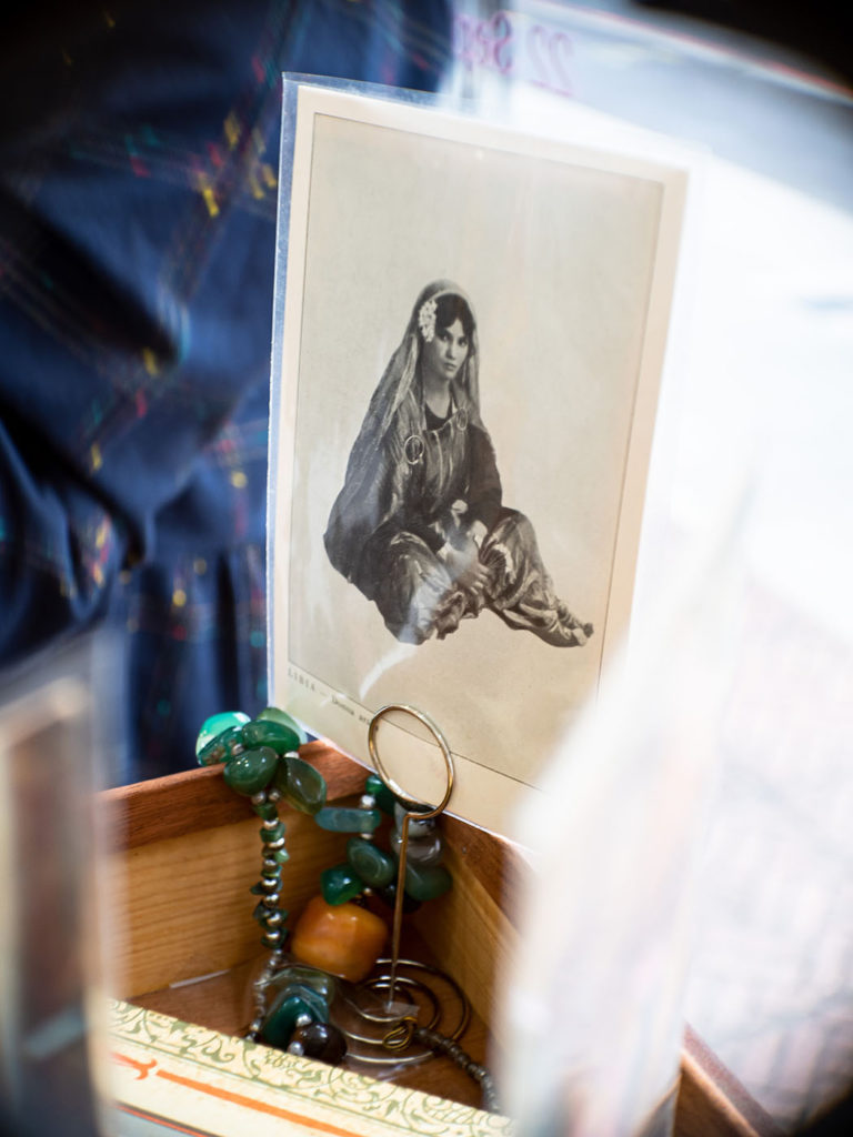 Ariella Aïsha Azoulay, a renowned academic and also an artist, is another extraordinary heroine who emerged from my collaborations and conversations. Her film the world like a jewel in the hand [sic] was screened at the exhibition, and it tells the story of imperial violence and plunder that ripped and continues to rip Algerian Jews away from their heritage as Arabs, as people invested and completely involved in a world shared by Muslim and Jewish Arabs and Berber/Amazigh people. Jewish silversmiths were making and using the same amulets as Muslims. Her epistolary essay to an unknown Algerian French relative, in our book, is a deeply personal and powerful revelation of how colonialism created “modern” as a progressive type in opposition to the “backward” Postcard Woman wearing her “traditional” clothes. She continues to search for her Algerian Jewish heritage through the physical acts of recreating jewelry that her ancestors must have once made.