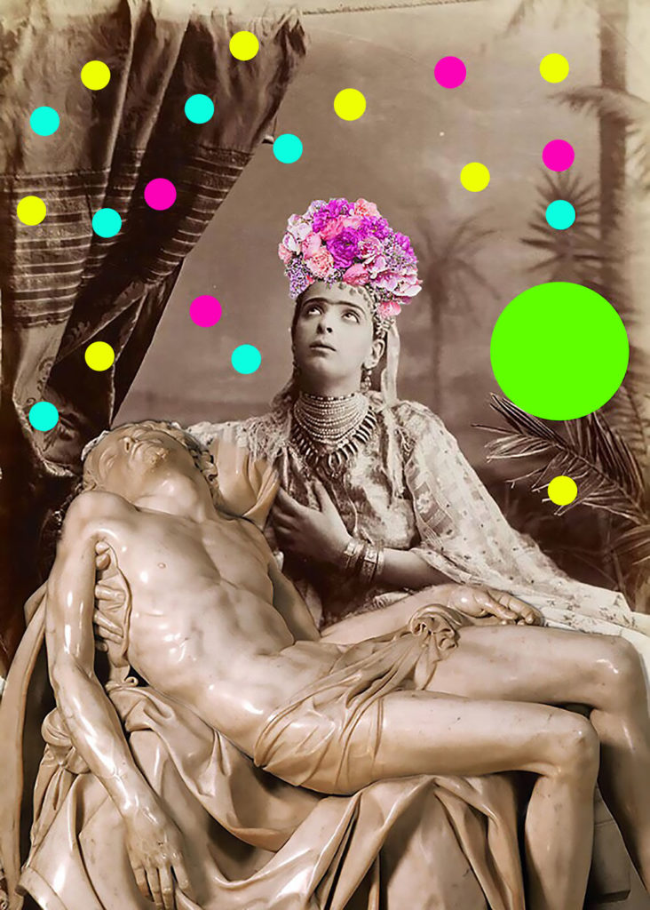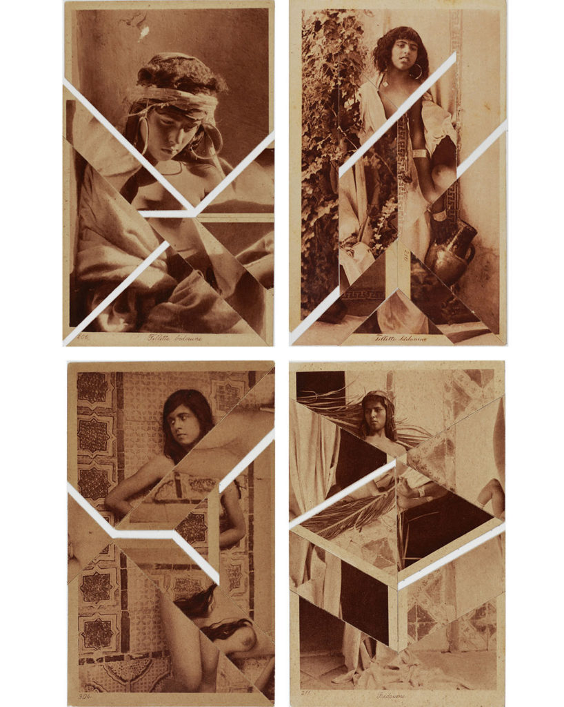 Recently we had an exchange in our Imaginarium discussion group with a French man, whose collection of images feature in a book of violent images, Sexe, race et colonies, by Blanchard, Bancel among others. I will leave the reader to look up this book, which troubled us a lot at the beginning of our journey. But we decided not to deal with these images. Even the images we have are bad enough and we didn’t want to recycle trauma. He told us that we were only dealing with “soft” images. As a European male, who is he to define for us what “soft” trauma is? Coincidentally, during this discussion online, Stephanie sent me a comment by a Tunisian woman, talking about the distress she felt seeing underage Tunisian girls on postcards at a flea market. No one can tell us what we should or should not feel. Eugenia and Miguel dealt with these images of Tunisian girls in a poetic, protective and incisive manner, using the ornament of “Islamic Spain.” Just imagine that.