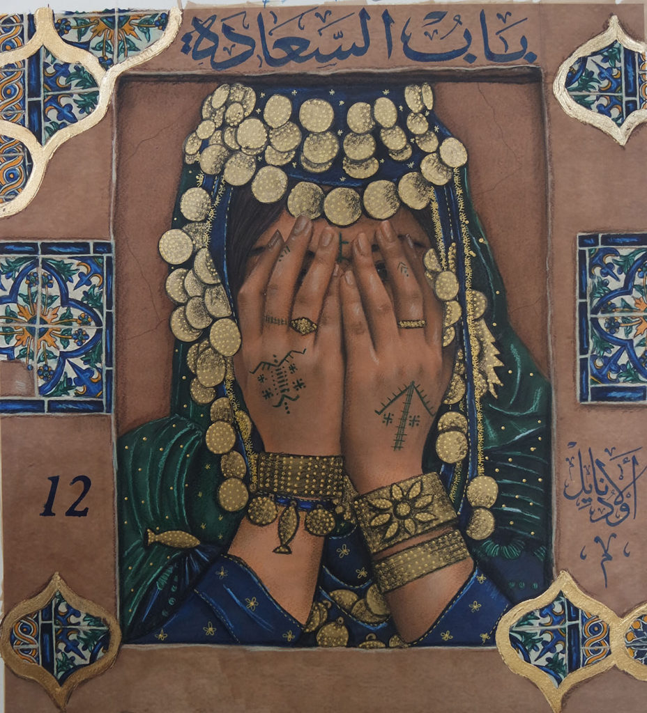 When we dismantled the exhibition this month, it felt like a destructive act, yet I knew a chain reaction had begun at last. Alia Derouiche Cherif’s mesmerizing re-imaginings of Ouled Nail women, mixed-media works, richly steeped in her Tunisian culture of “now” and “then,” seemed to still hang in the air, their iconic richness, blues, greens and golds, a lingering musk. Those hands covering the face of a Ouled Nail woman — a work Alia named “Beb el Saada: Door of Joy,” covering an image of the shame we are supposed to feel as women, or that historically Ouled Nail women have been made to feel, has now been transformed by her own hands into a potent gesture of refusal and sorrow.