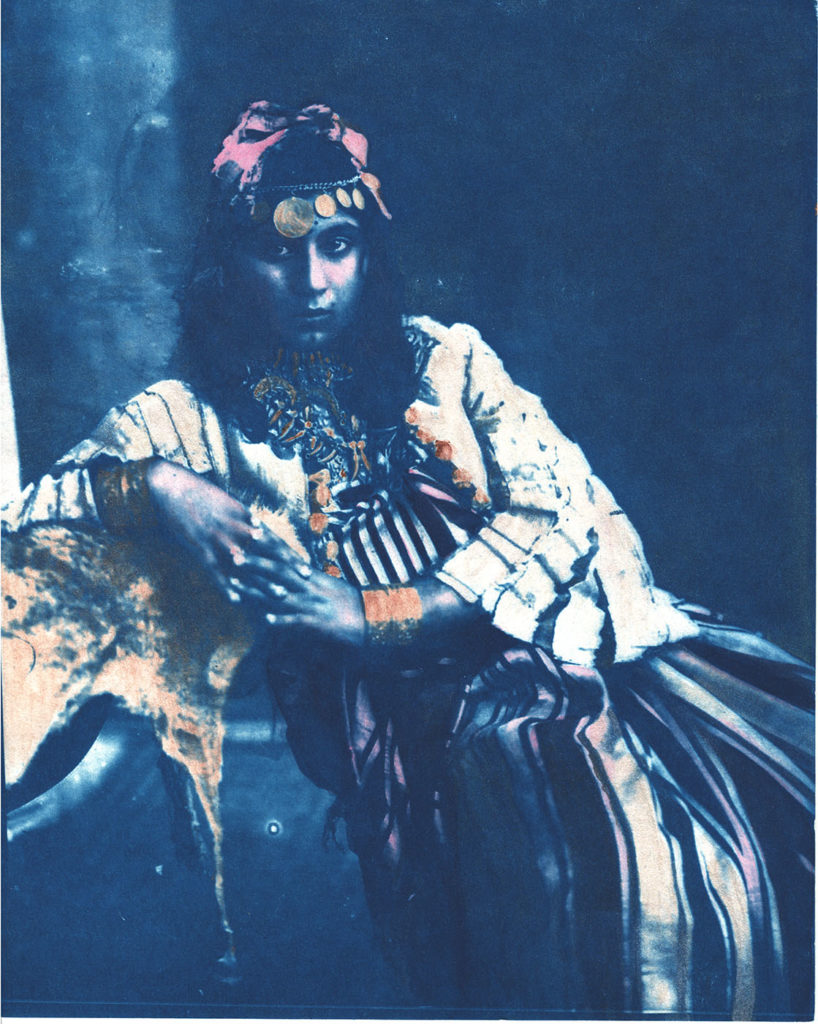 I wanted to create a disturbing juxtaposition of sacred, profane, religious, philosophical and historical texts, and bring into relief how women are thought and written about, from the past and present. I wanted people to hear radical women’s voices speaking, through my voice. I projected refracted light and inserted multiple histories over my Egyptian Postcard Women, to activate the concealed colonial space and draw in layers of presences of others. “Palimpsests: Presences of Others” is both book chapter and installation, of photographs I had taken of these projections, and the things and materials I used to insert multi-ethnic Egypt into the frame. I also inserted my own subjective mixed Egyptian English presence, using things belonging to my English mother.